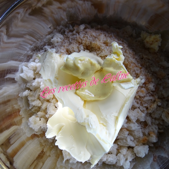 Mélangez les miettes de pain avec le beurre fondu et la moutarde (idem que pour le mélange crème moutarde, réduisez la quantité de moutarde si vous n’aimez pas quand ça pique).