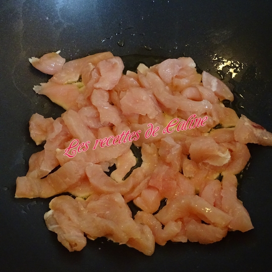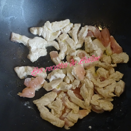 Dans un wok, faites chauffer 1 cuil à soupe d’huile d’olive et y faire revenir la viande. Réservez sur une assiette