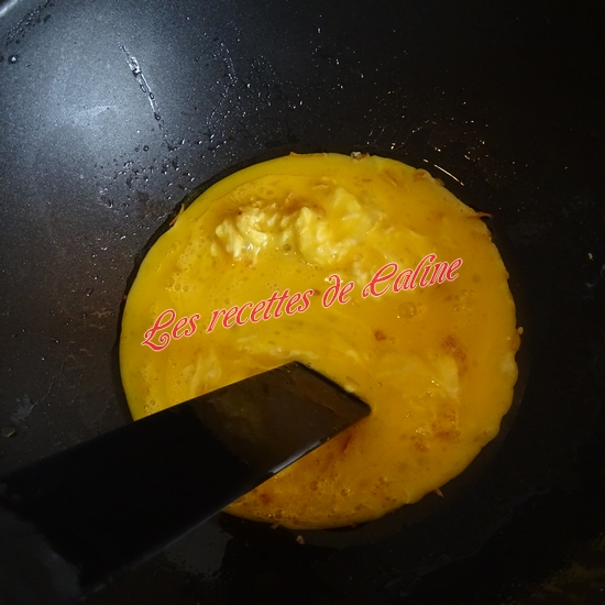 Dans le même wok à feu vif , remettre un peu d’huile, faites revenir l’oignon, casser les oeufs dans un bol, battez-les grossièrement et ajoutez-les au oignons. Faites-les cuire jusqu’à ce qu’ils ne soient plus liquides.