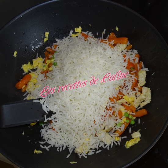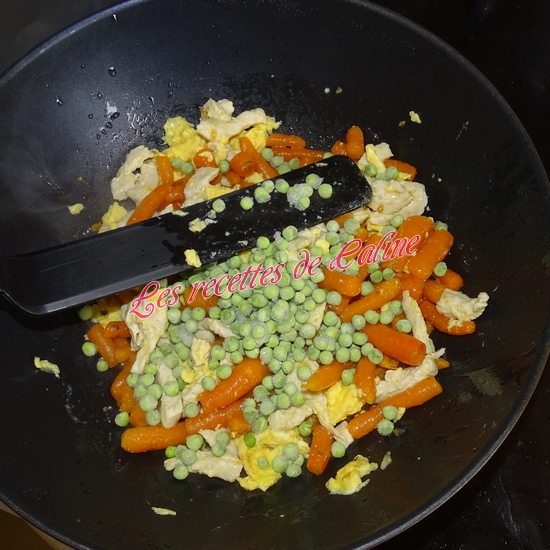Ajoutez les petits pois (encore congelé), puis le riz. Ne pas cessez de remuer pendant 1 à 2 minute de plus jusqu’à ce que