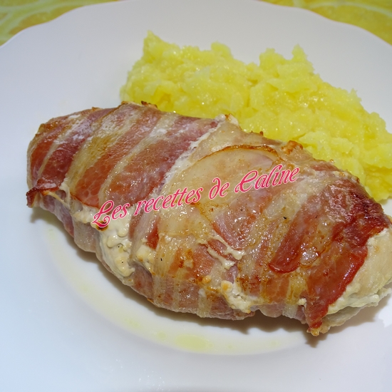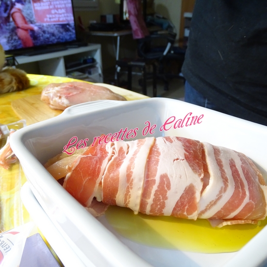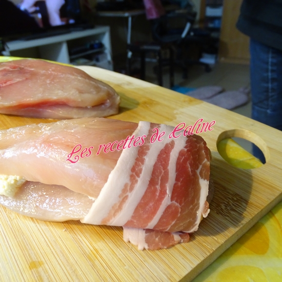 Entourez chaque blanc de poulet avec 2 à 3 tranches fines de poitrine fumée. Elles doivent se chevaucher.