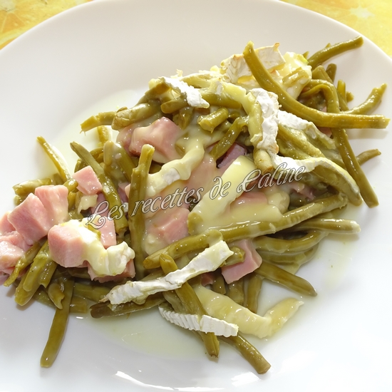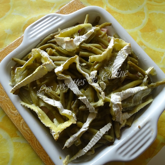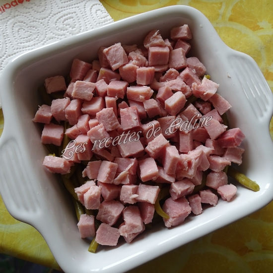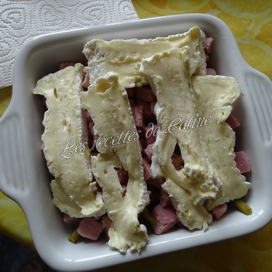 Placez quelques haricots verts, puis quelques dés de jambon, quelques lamelles de camembert, puis le reste des haricots verts et de dés de jambon.