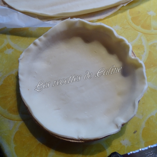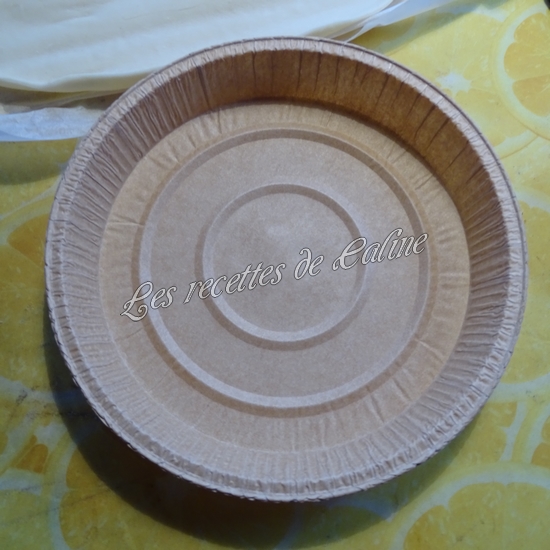 Etalez la pâte feuilletée dans un moule à tarte légèrement beurré et fariné puis piquez-la(pour ma part, j’utilise des moules en papier cuisson donc pas besoin de graisser le moule)