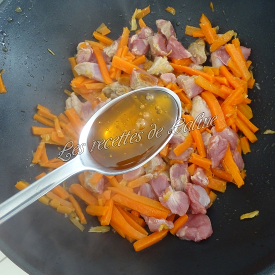 Ajoutez la viande, le miel, la sauce soja et le gingembre.