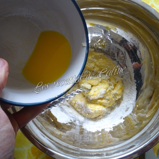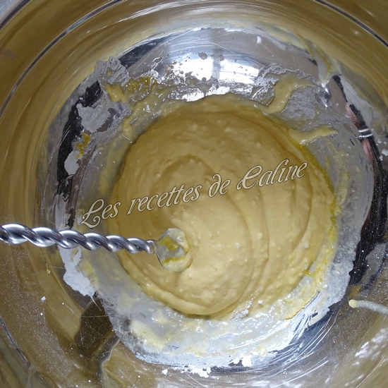 Dans un récipient, mélangez la farine, la fécule de maïs, la levure. Incorporez le lait, les jaunes d’oeufs et le beurre fondu.
