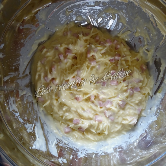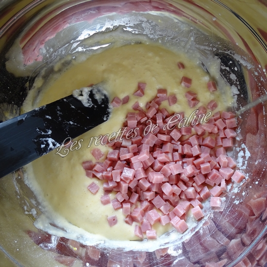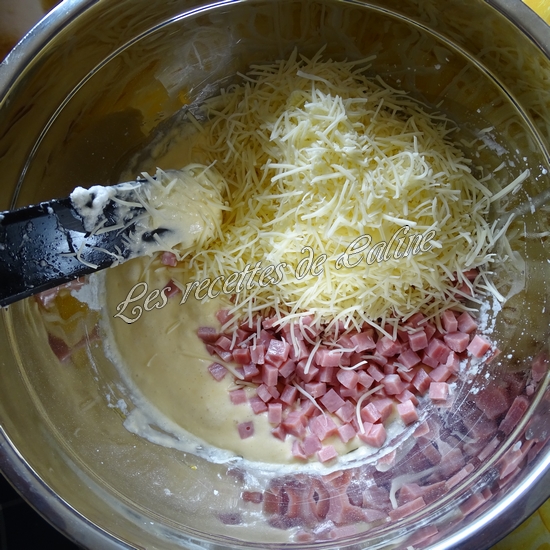 Montez les blancs d’œufs en neige avec le sucre et le sel. Incorporez-les dans l’appareil. Ajoutez l’emmental râpé et le jambon.
