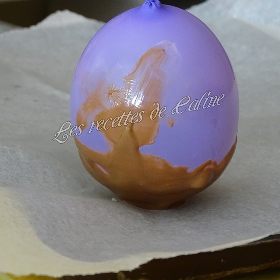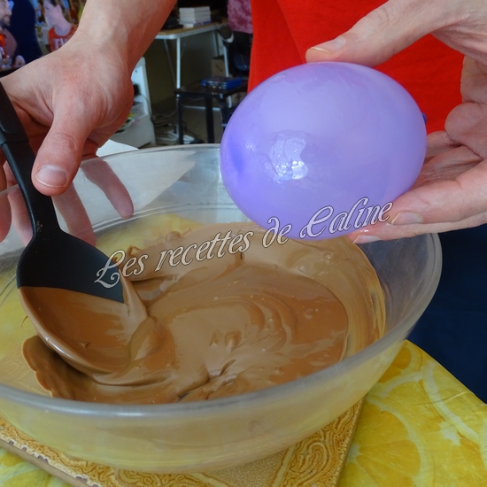 Percez les ballons délicatement, puis dressez votre mousse au chocolat dans les coques en chocolat durcies.