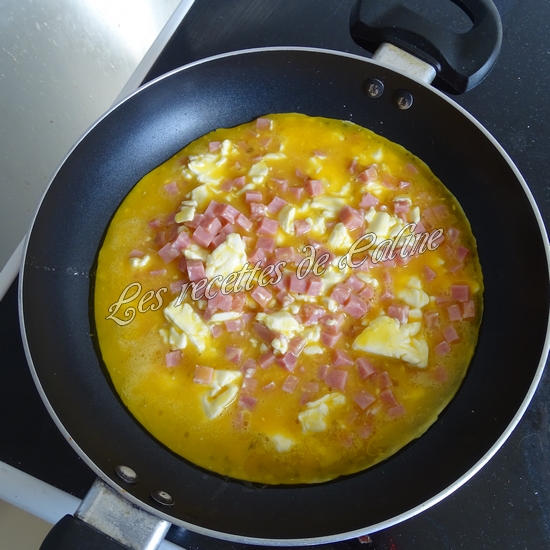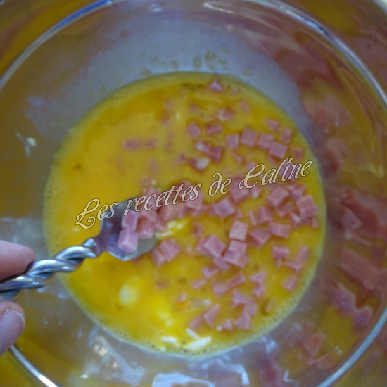 Dans un bol, fouettez les oeufs, ajoutez le jambon et le fromage a tartiner.