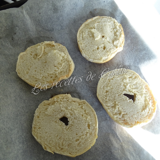 griller légèrement au grille-pain ou à la poêle (pour ma part, ce sont des bagels surgelés, donc je les cuits au four avant, donc pas besoin de les griller).