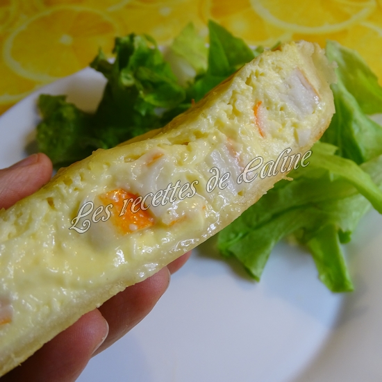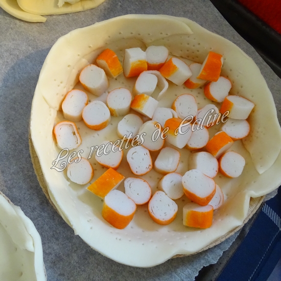 Coupez les surimi en petits morceaux et placez-les dans le fond de la pâte.