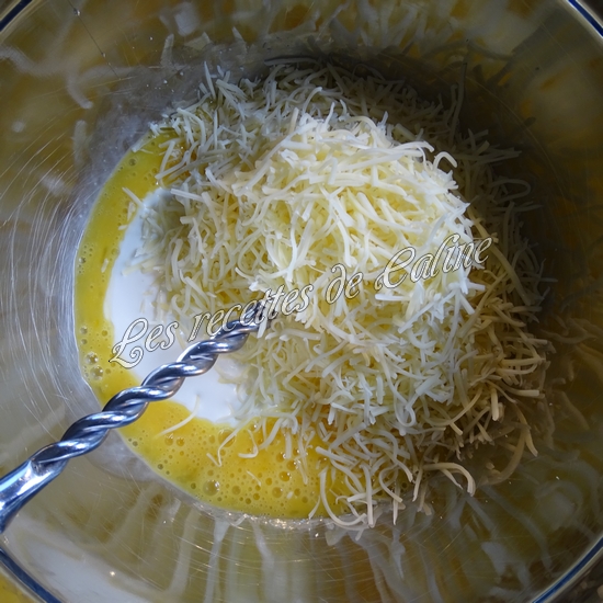Dans un récipient, mélangez la crème, le gruyère, les oeufs, le sel et le poivre.