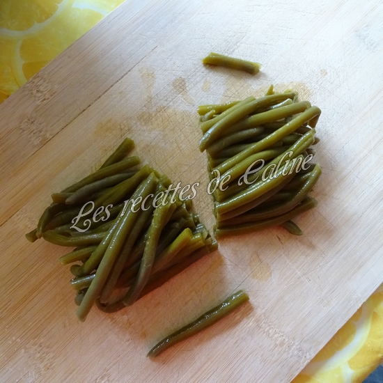 Rincez et égouttez les haricots verts et coupez-les en deux
