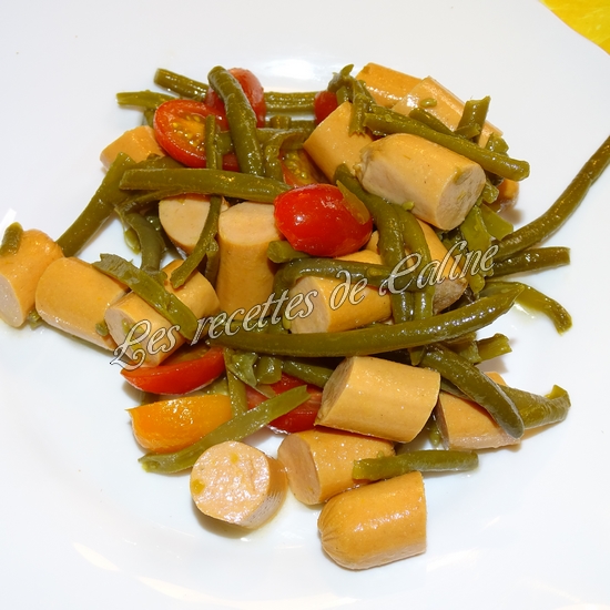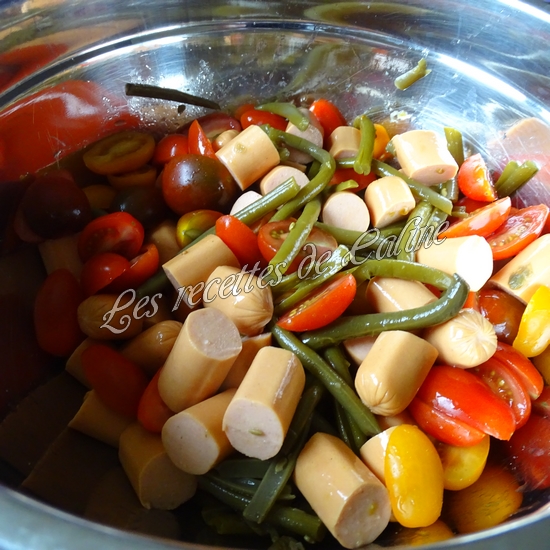 Mettez les saucisses, les haricots verts et les quartiers de tomates dans le saladier, bien mélanger avec la vinaigrette.