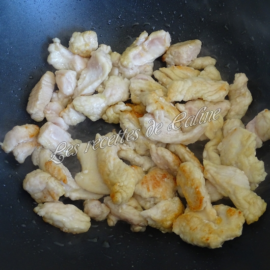 Dans une poêle, faites chauffer l’huile d’olive puis faites revenir les lamelles de poulet