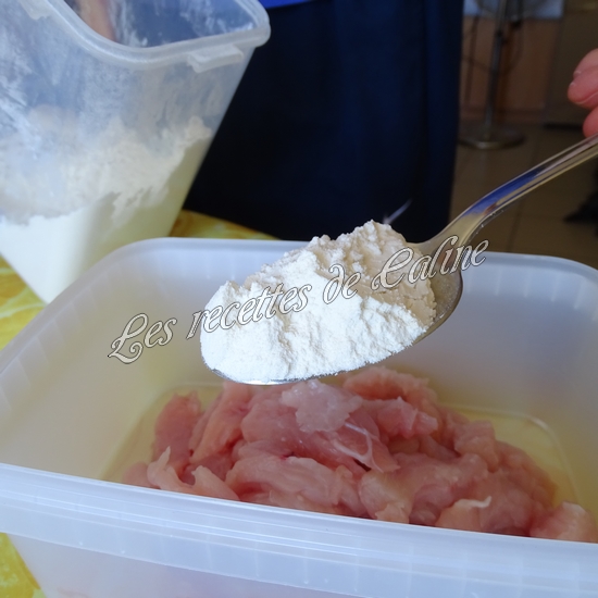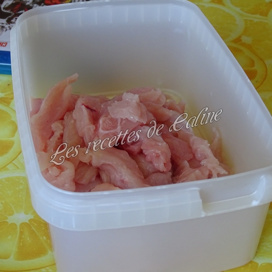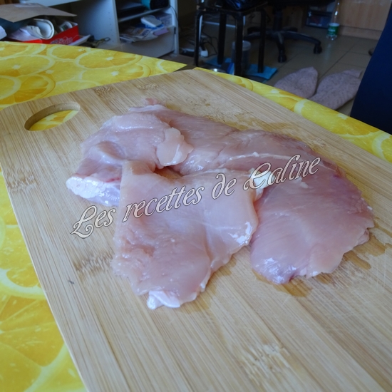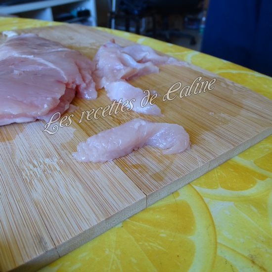 Coupez les blancs de poulet en fines lamelles puis farinez-les.