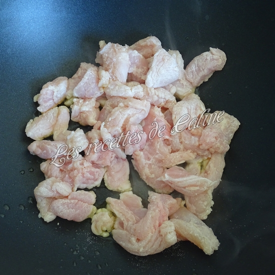 Dans une poêle, faites chauffer l’huile d’olive puis faites revenir les lamelles de poulet