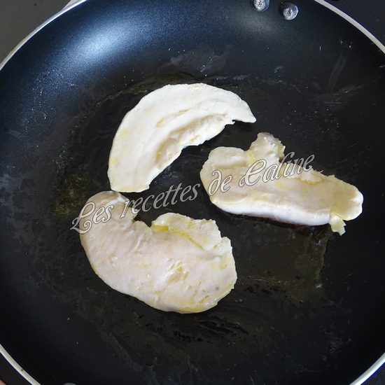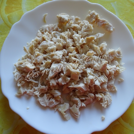 Faites cuire les aiguillettes de poulet, coupez-les en tout petits morceaux. Réservez.