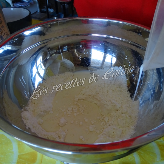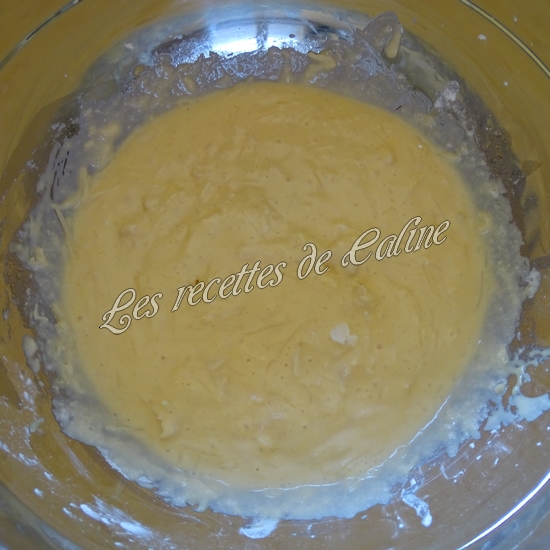 Dans un récipient, mélangez la farine, la maïzena, la levure. Incorporez le lait, les jaunes d’oeufs et le beurre fondu.