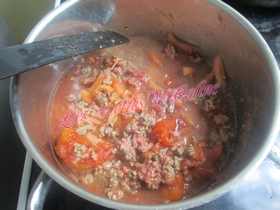 Ajouter la boite de tomates pelées et remplir l’équivalent de la moitié de la boite en eau que l’on verse ensuite dans le plat.