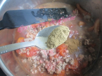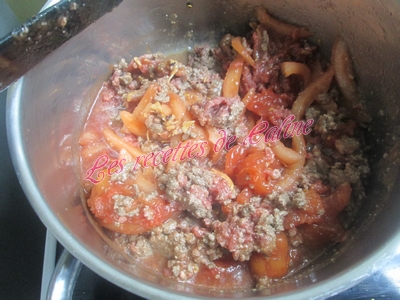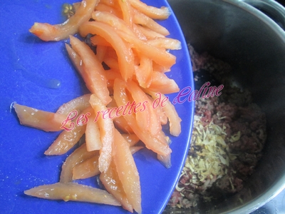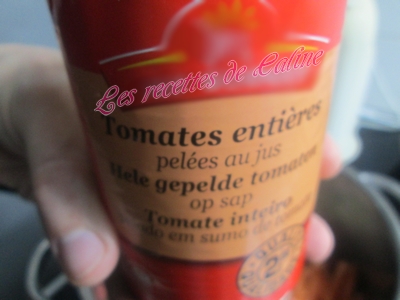 Ajouter la boite de tomates pelées et remplir l’équivalent de la moitié de la boite en eau que l’on verse ensuite dans le plat.