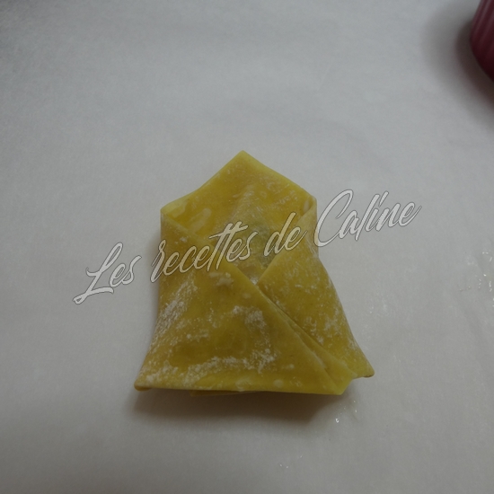 Remplissez chaque carré de pâte wonton avec environ 1 cuillère à café de farce, rassemblez les coins du carré de pâte pour former des triangles, ou des boutons de fleurs.