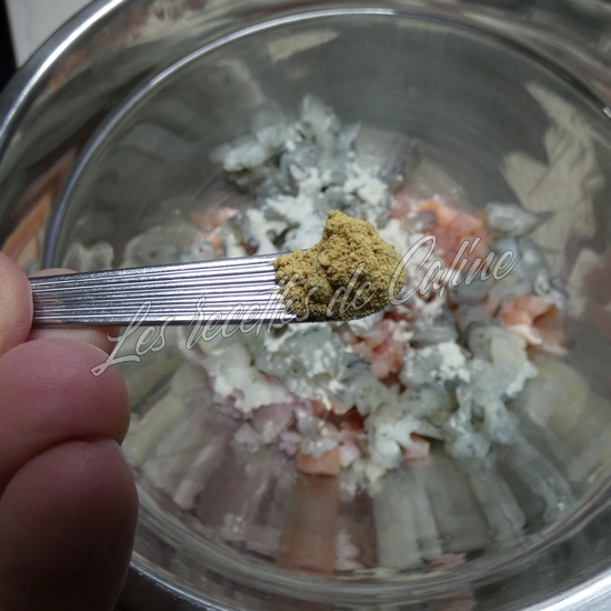 Mélangez les crevettes coupées en petits morceaux , le porc coupé aussi en petits morceaux, l’échalote émincé, la fécule de maïs, le sucre, le sel et le poivre dans un bol.
