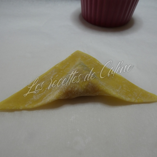 Remplissez chaque carré de pâte wonton avec environ 1 cuillère à café de farce, rassemblez les coins du carré de pâte pour former des triangles, ou des boutons de fleurs.