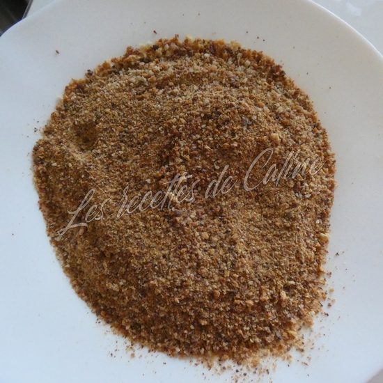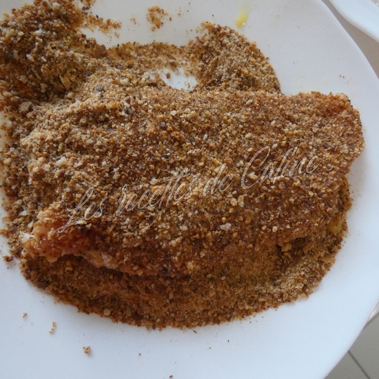 Mixez les biscottes ou pain rassis (pour ma part, j’utilise des petits croutons de pain rassis (pain complet que fait mon boulanger) pour obtenir une poudre fine. Versez-la dans une assiette creuse.