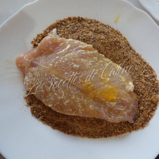 Mixez les biscottes ou pain rassis (pour ma part, j’utilise des petits croutons de pain rassis (pain complet que fait mon boulanger) pour obtenir une poudre fine. Versez-la dans une assiette creuse.
