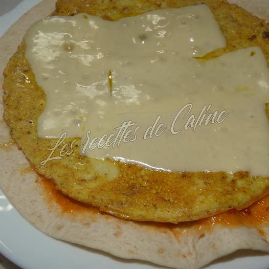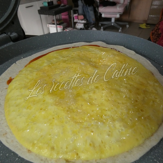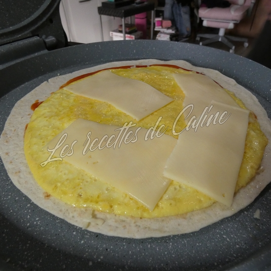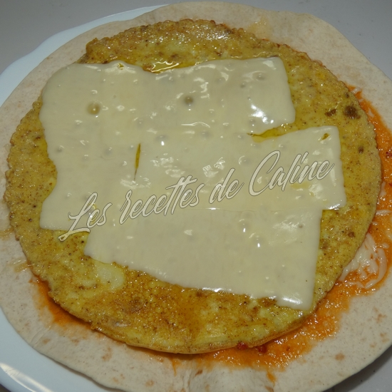 Dans une autre poêle ou au fun pizza, faites chauffez un wrap ou vous aurez étalé un peu de sauce de votre choix ainsi qu’un peu d’emmental râpé puis deposez par dessus l’omelette