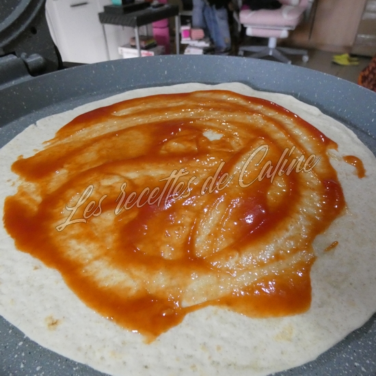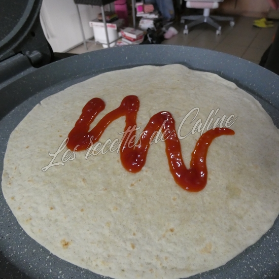 Dans une autre poêle ou au fun pizza, faites chauffez un wrap ou vous aurez étalé un peu de sauce de votre choix ainsi qu’un peu d’emmental râpé puis deposez par dessus l’omelette