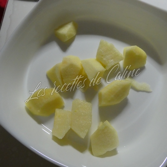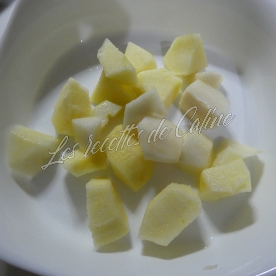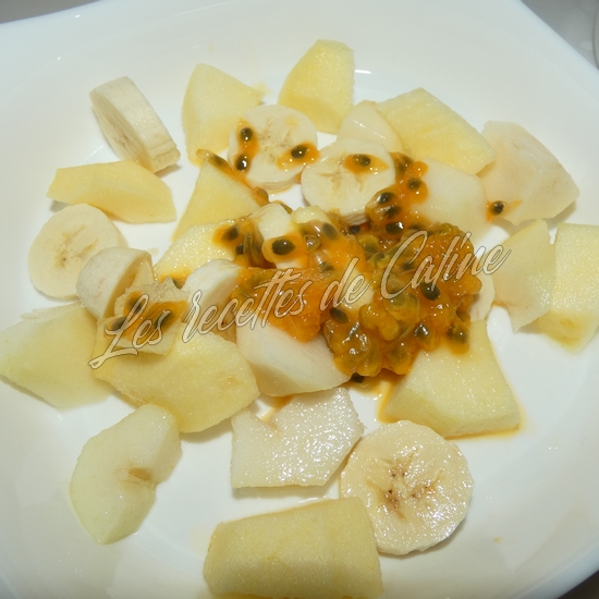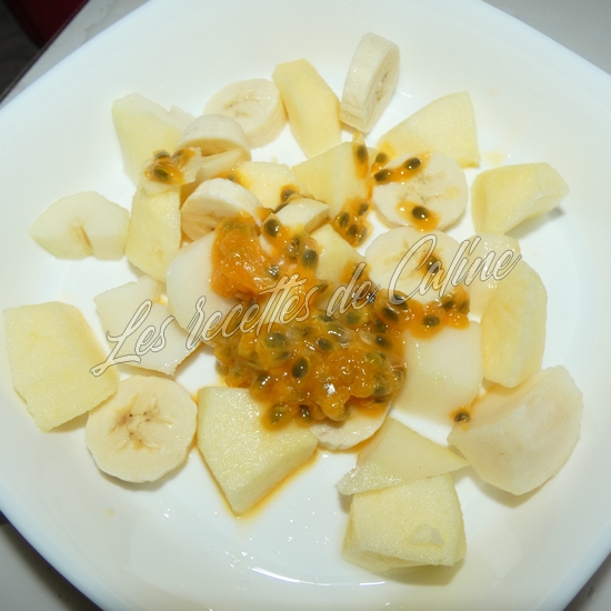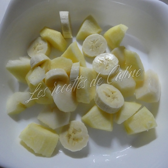 Epluchez et coupez la poire, la pomme et la banane. 1/2 fruit par personne.