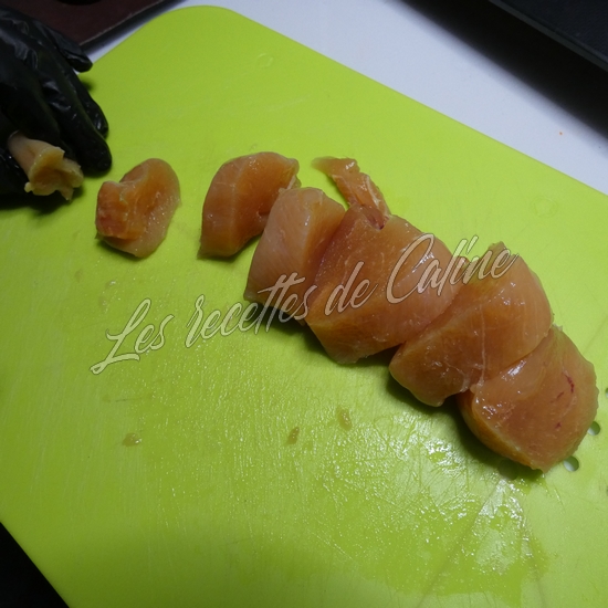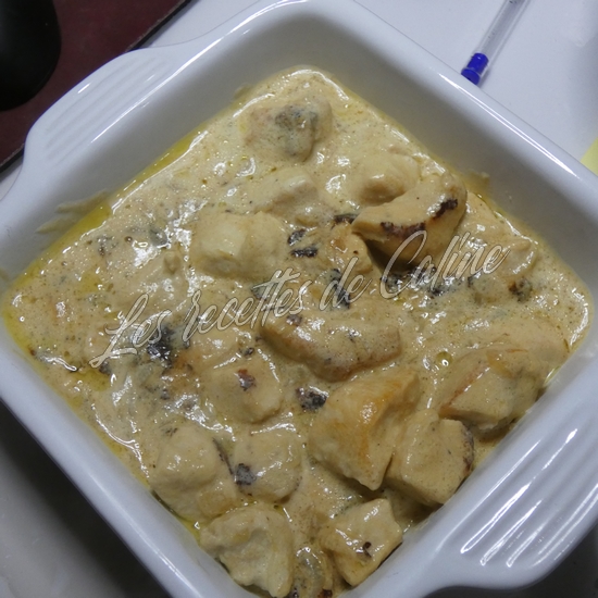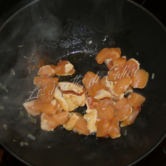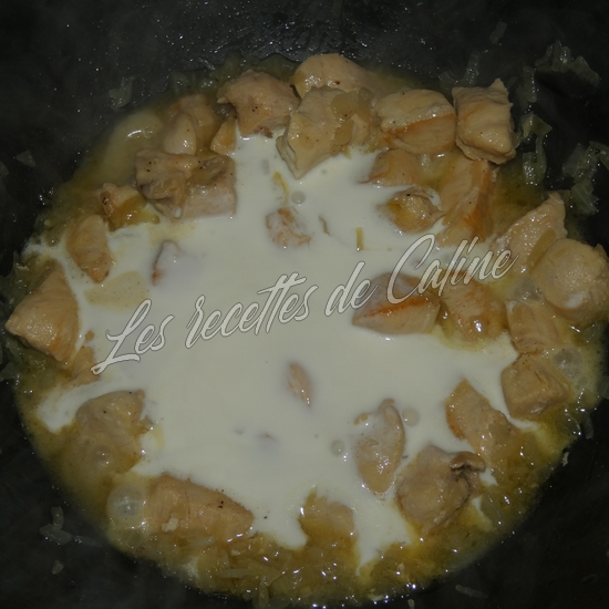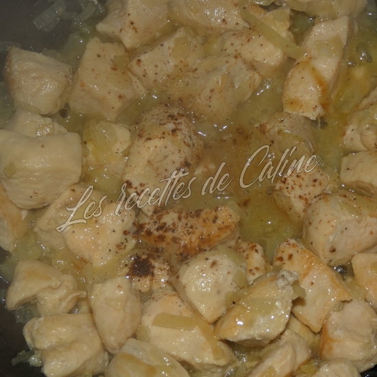 Coupez les filets de poulet en morceaux et faites les dorer dans la même poêle. Lorsque le poulet est coloré, salez, poivrez, ajoutez la noix de muscade et la crème liquide. Faites cuire à feu doux pendant 10 min environ.