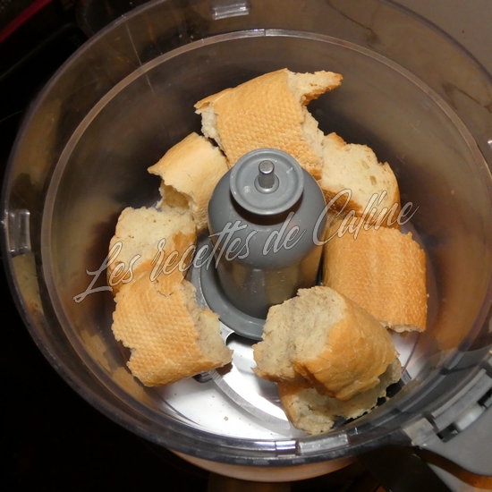 Mixez le pain rassis par à coup dans un mixeur jusqu’à l’obtention de grosses miettes.
