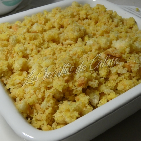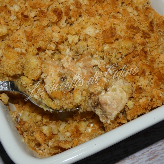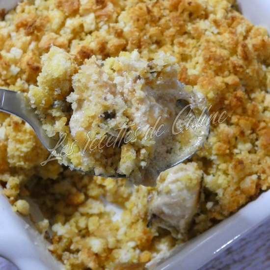 Versez le poulet et la sauce à la crème dans un plat et répartissez le crumble de pain par dessus.