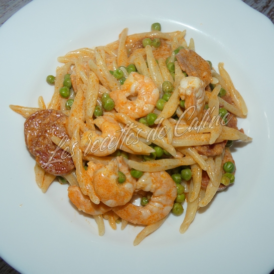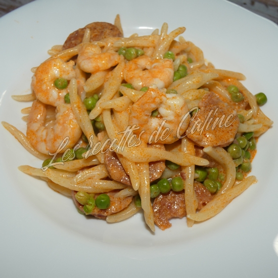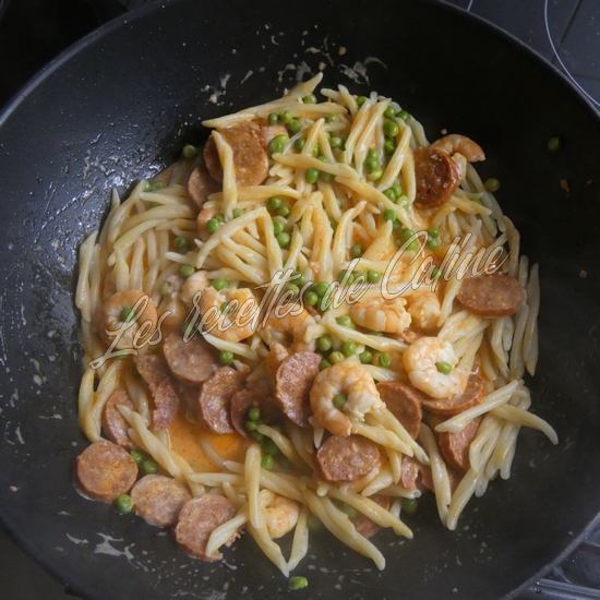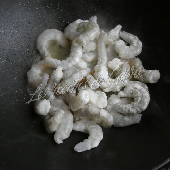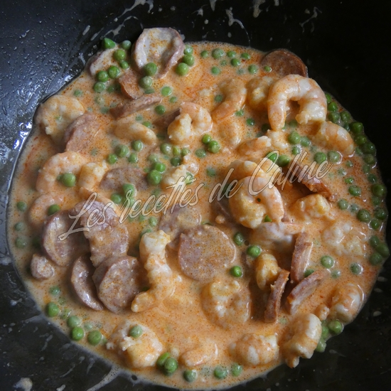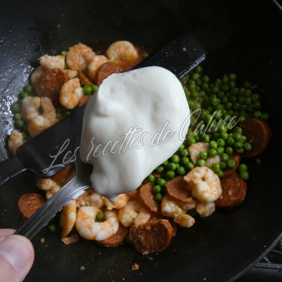 Dans une poêle, ajoutez les crevettes, le chorizo et mélangez pendant