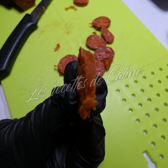 Pendant ce temps, enlevez la peau du chorizo si vous le souhaitez et coupez-le en fines tranches.