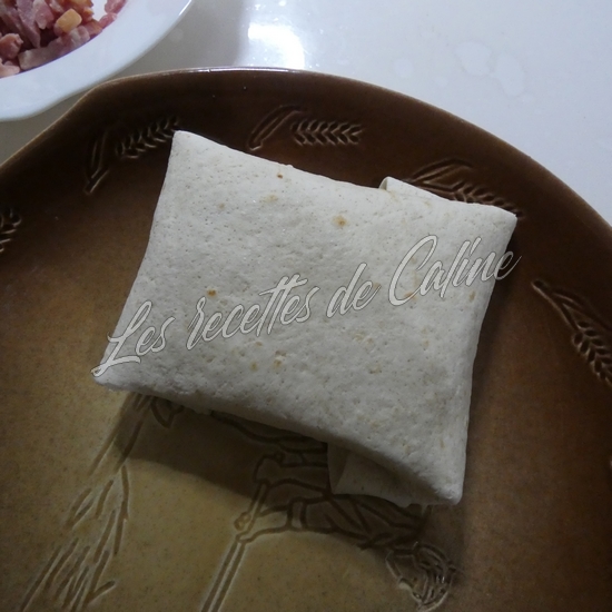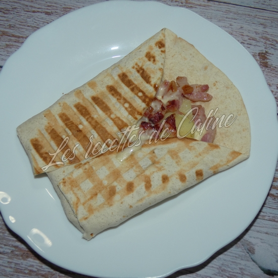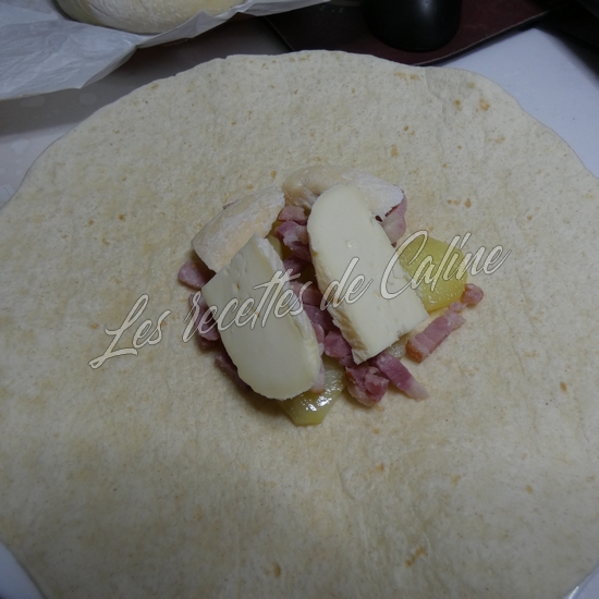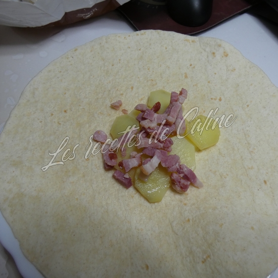 Etalez une galette de blé sur une assiette, placez y quelques rondelles de pommes de terre, quelques lardons et quelques lamelles de fromage