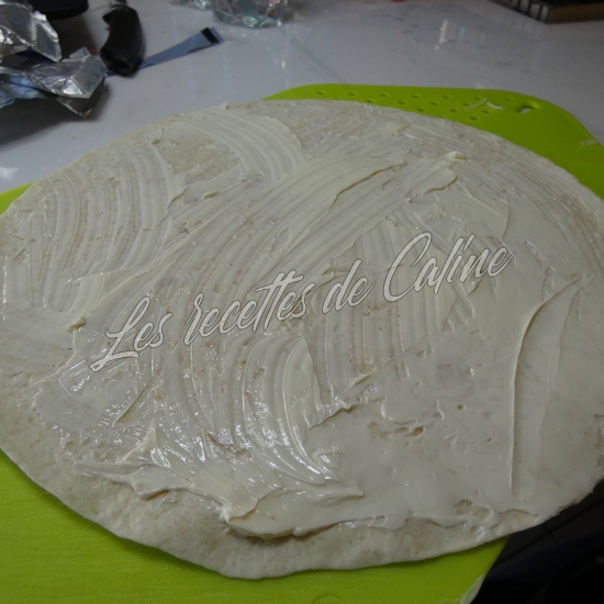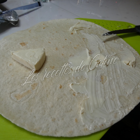 Déposer un wrap dans une assiette et Le tartiner avec la vache qui rit