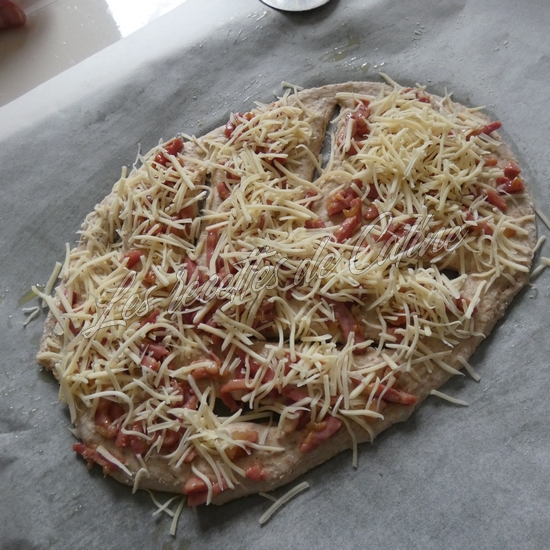 Fougasse en les enfonçant un peu dans la pâte. Saupoudrez le tout d’une généreuse couche de fromage râpé.