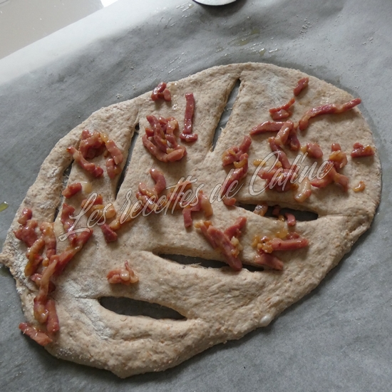 Fougasse en les enfonçant un peu dans la pâte. Saupoudrez le tout d’une généreuse couche de fromage râpé.