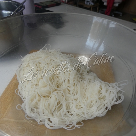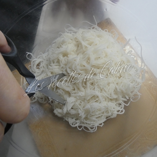 Faire tremper les vermicelles dans de l’eau tiède (les immerger complètement) pendant 5 à 6 min, egouttez les et a l’aide d’un ciseau coupez les