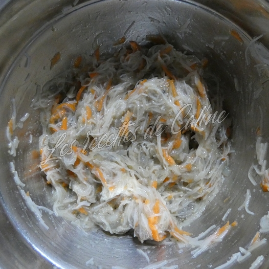 Dans un grand bol, mélanger les nouilles, les crevettes hachées, la carotte râpée,