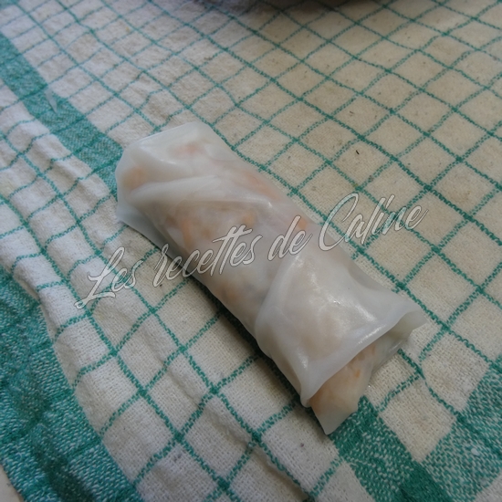 Pour envelopper chaque rouleau, placez une feuille de papier de riz dans l’eau sucrée pendant environ 5 à 10 secondes, en vous assurant qu’elle est complètement immergée. Retirez-la de l’eau. Elle sera encore assez ferme, mais elle ramollira rapidement !