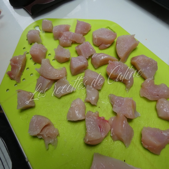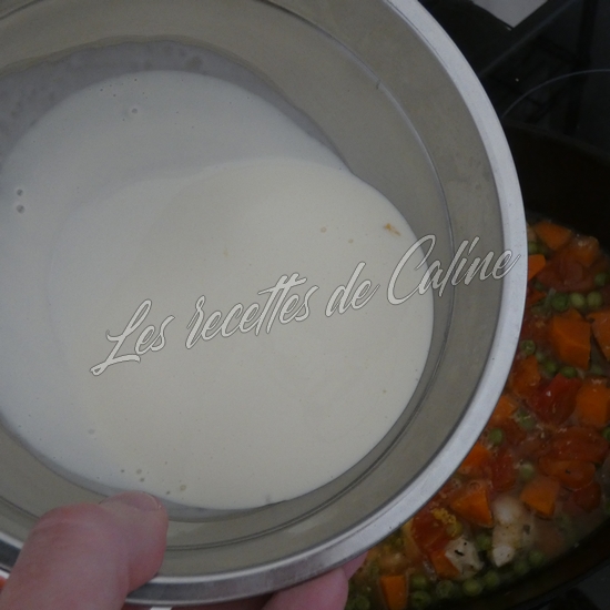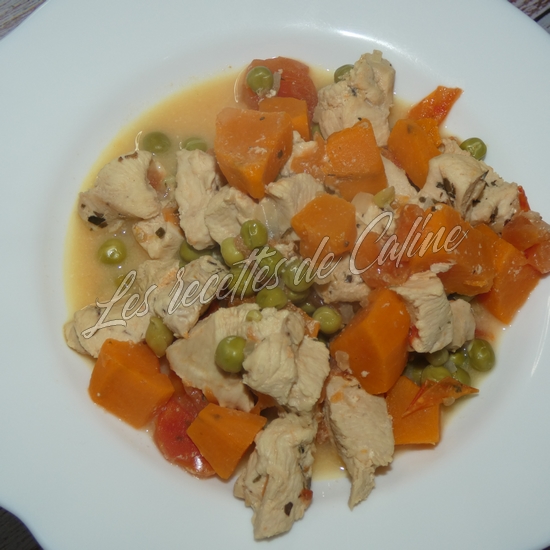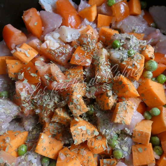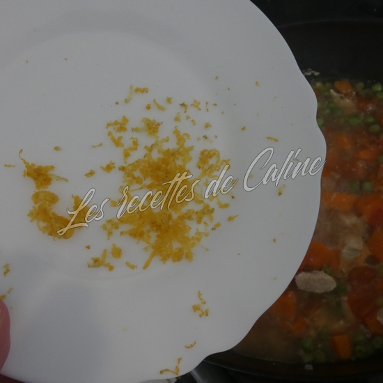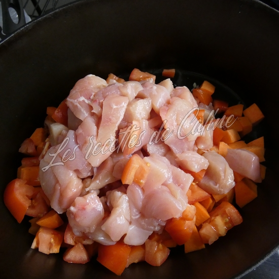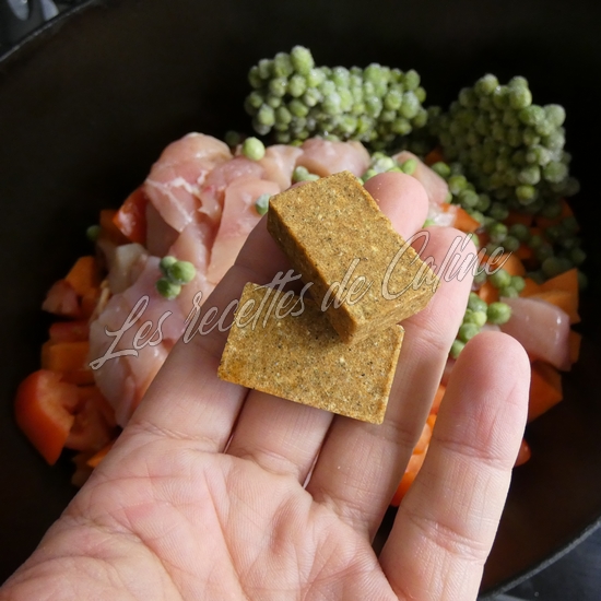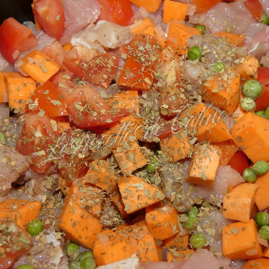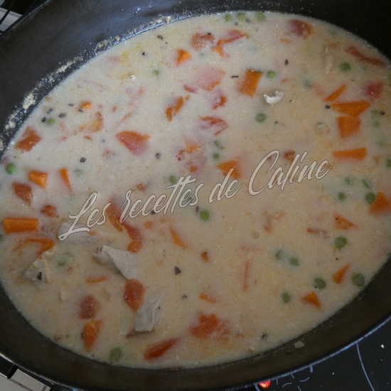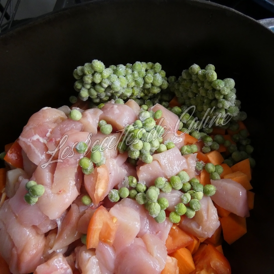 Mettez le poulet, les petits pois, les patates, l’oignon et les tomates coupées en morceaux, thym, laurier et bouillon de volaille dans une marmite.