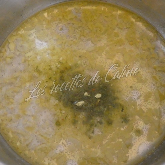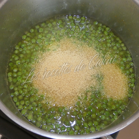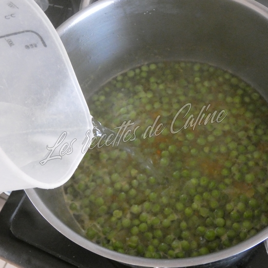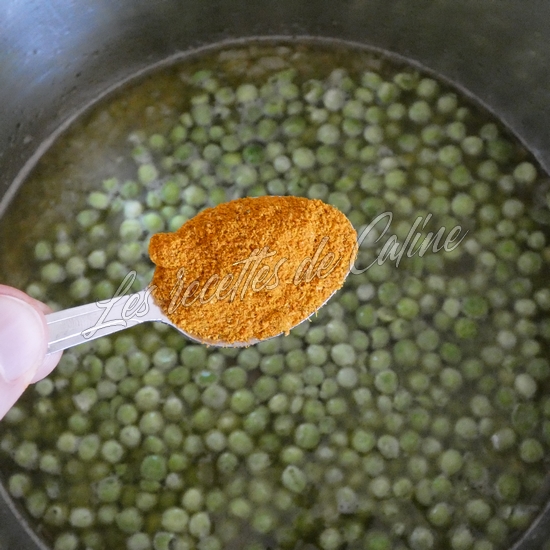 Ajoutez 1 verre d’eau (15 cl), le cube de bouillon émietté, les petits pois, le curry et laissez mijoter 5 min après ébullition.