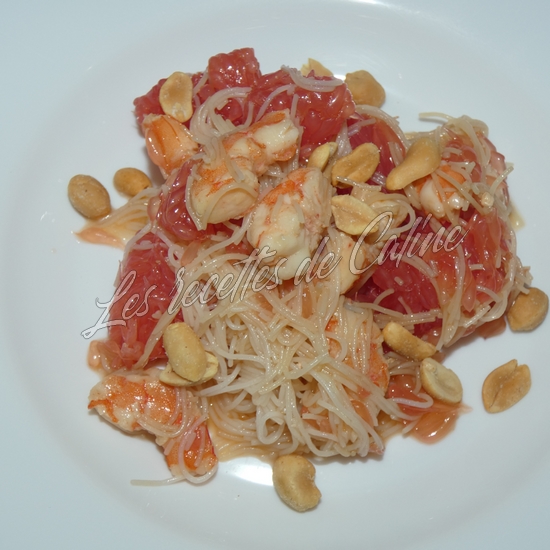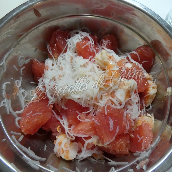 Déposez sur les vermicelles les crevettes décortiquées et coupées en deux (j’ai utilisé des crevettes crues que j’ai cuit la veille).