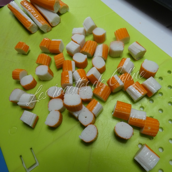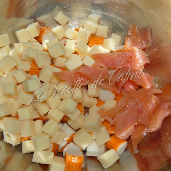 Coupez le saumon fumé en morceaux, le surimi en petits tronçons et le gruyère en petits dés.