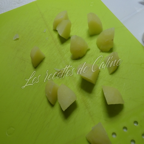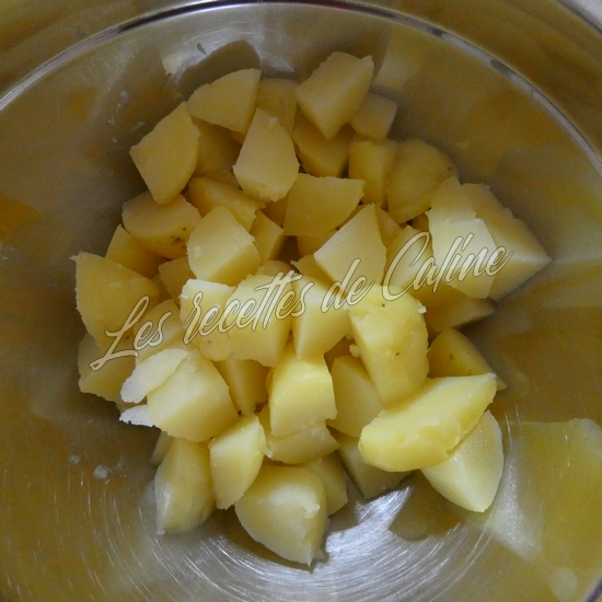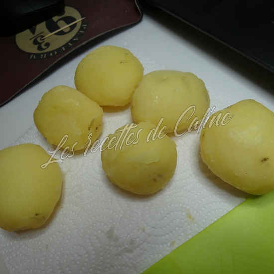 Épluchez ou non les pommes de terre et faites les cuire pendant 25 à 30 minutes. Une fois cuites, plongez les dans l’eau froide quelques minutes( Pour plus de fermeté vous pouvez les éplucher après la cuisson.)