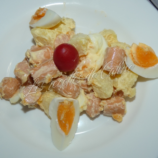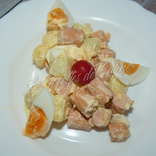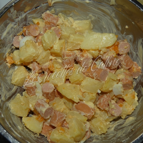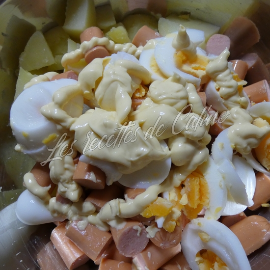 Dans un grand saladier coupez les pommes de terre refroidies en petits dés, coupez les saucisses en petits tronçons, et coupez les œufs en rondelles.